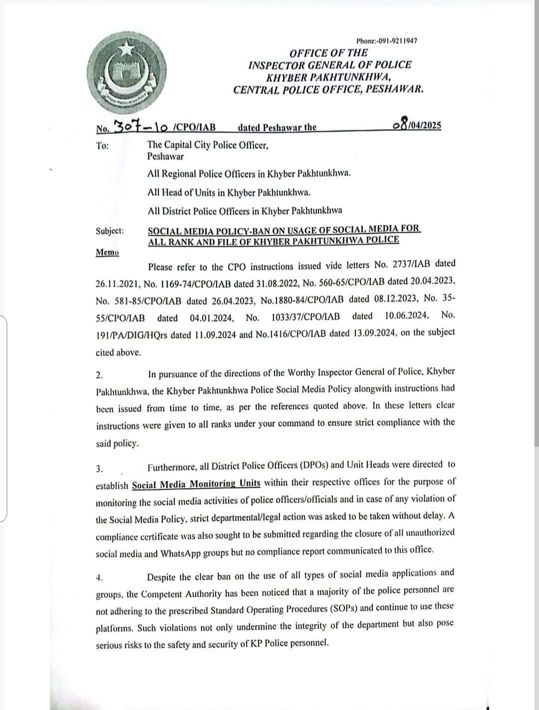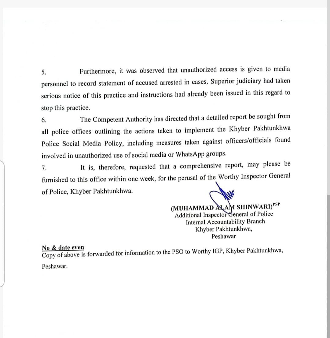 Additional Inspector General of Police, Internal Accountability Branch, Muhammad Alam Shinwari, has warned all units that if they do not fully implement the social media policy, action will be taken against them. Police officials have made it clear that no negligence will be tolerated now.